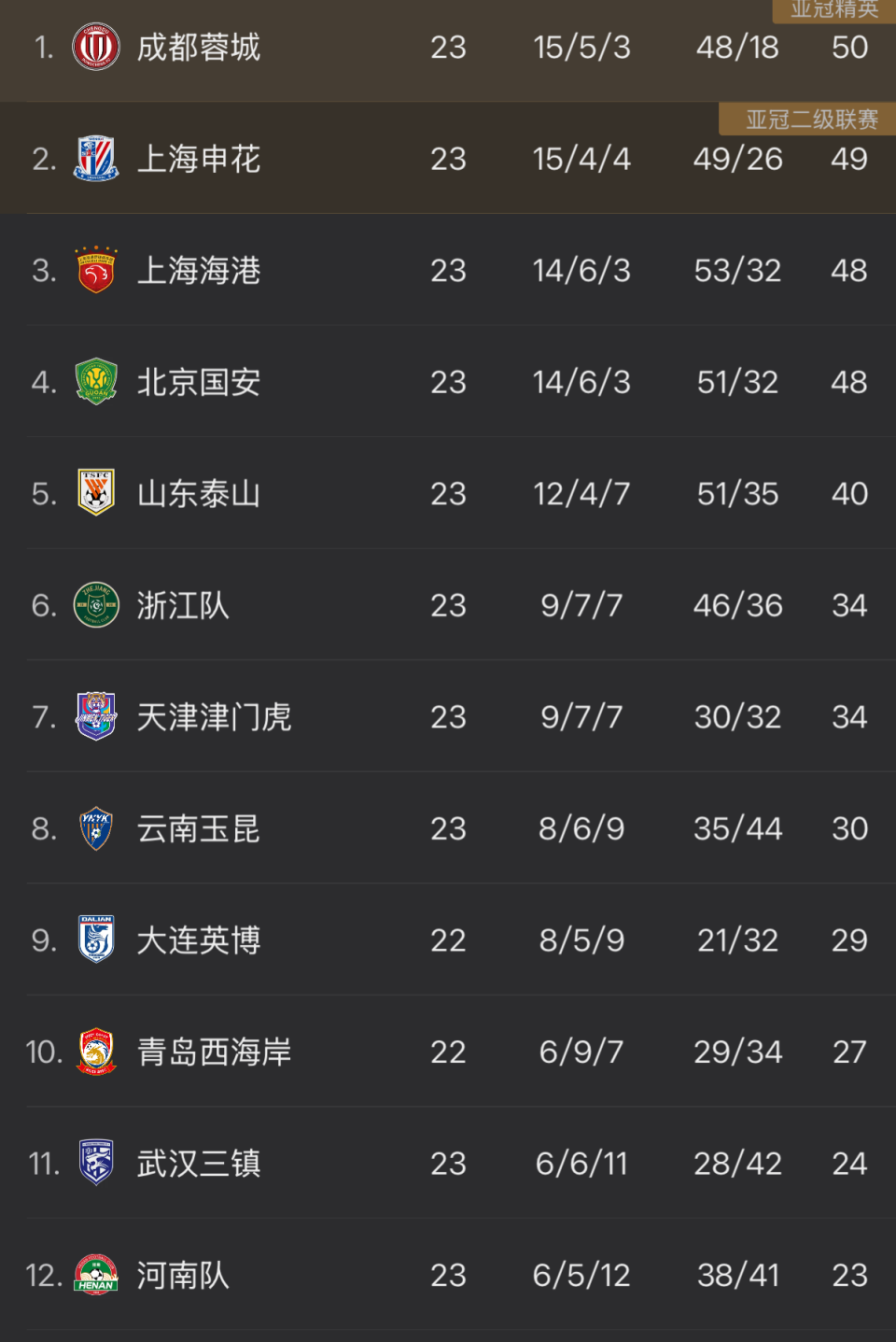 目前中超前4名分差依然很小,蓉城积50分领跑,申花49分排名第2,海港和国安都是48分,海港凭借净胜球优势排名第3,国安退至第4。而泰山凭借本轮大胜国安的强势表现,积分来到40分,稳坐第5的位置。