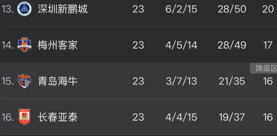 保级队方面,深圳新鹏城在一场关键战中2-0力挫梅州客家,终结5连败后积20分领先降级区4分,梅州客家下跌1位积17分,排名倒数第3位,海牛和亚泰同积16分,亚泰因为净胜球劣势暂时垫底。